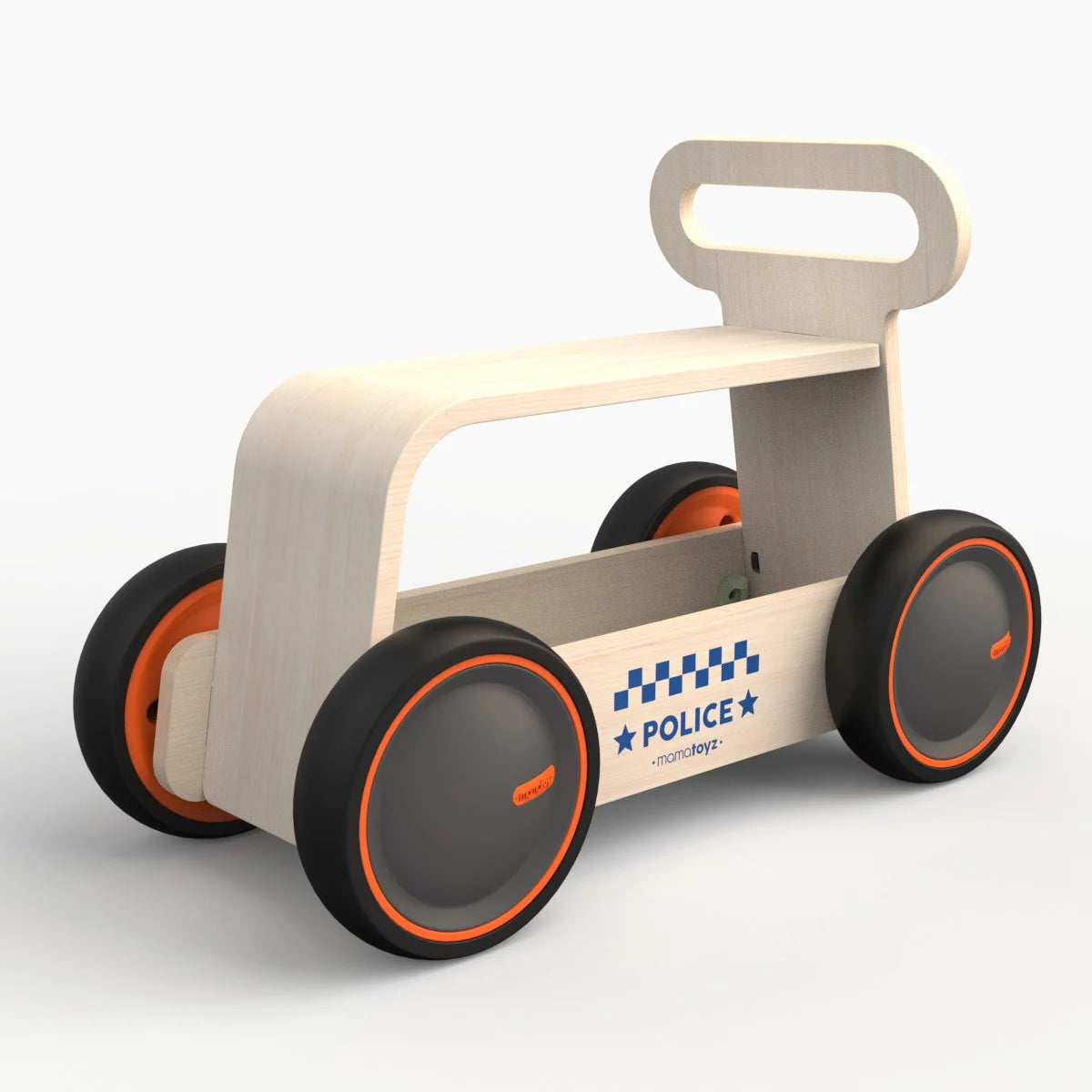 Masinuta ride-on, premergator si carucior de jucarii MamaToyz DriveMe Wood, Politie - Jucarie din lemn 3 in 1
