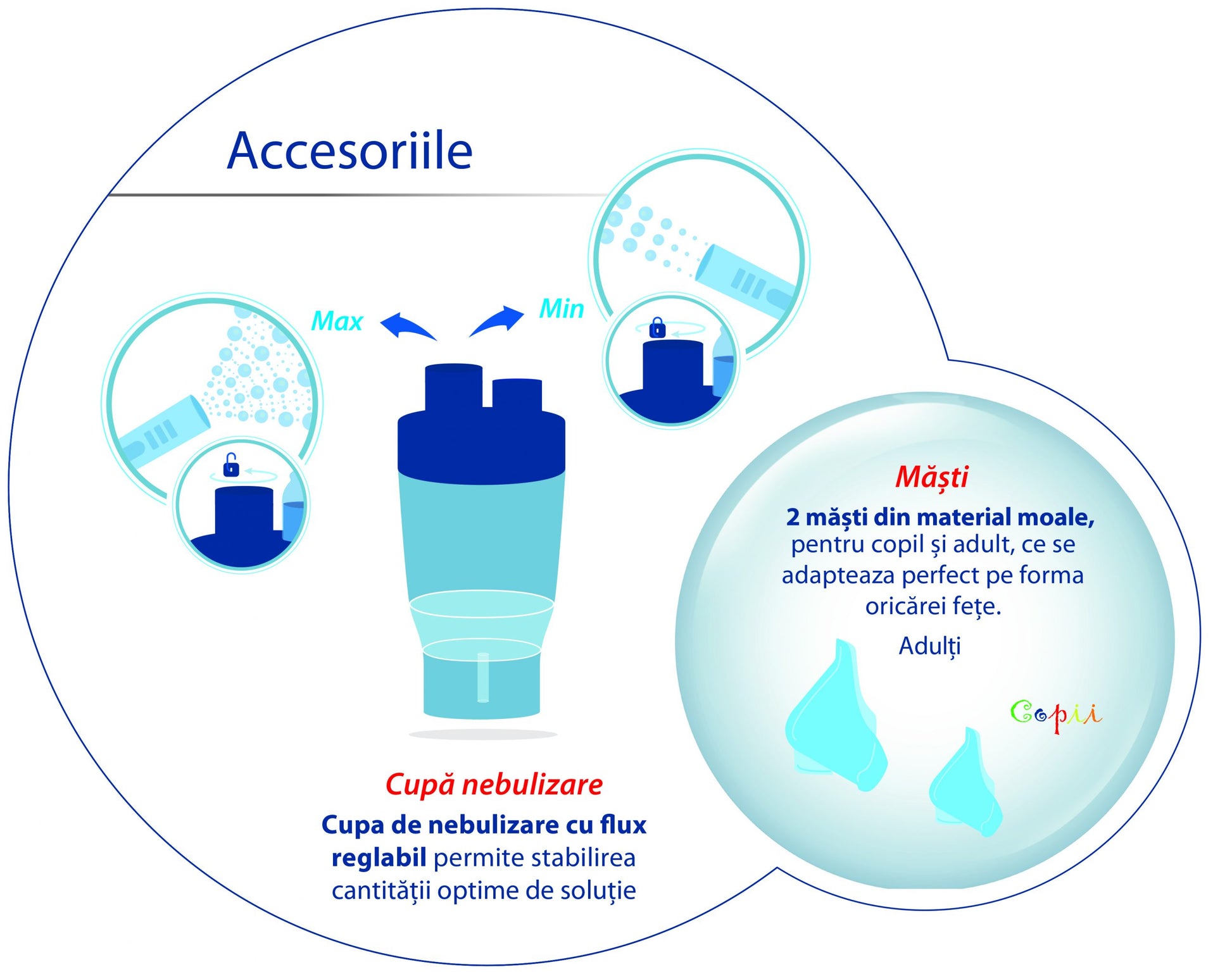 - Cupa de nebulizare cu flux reglabil, in functie de tipul substantei nebulizate;