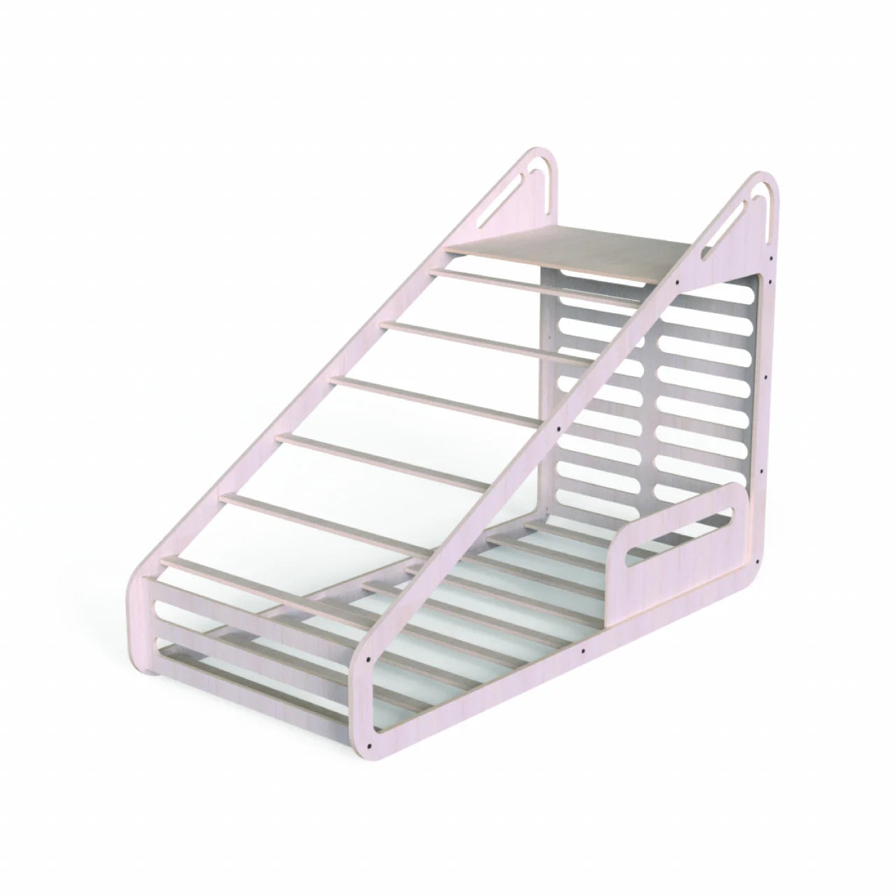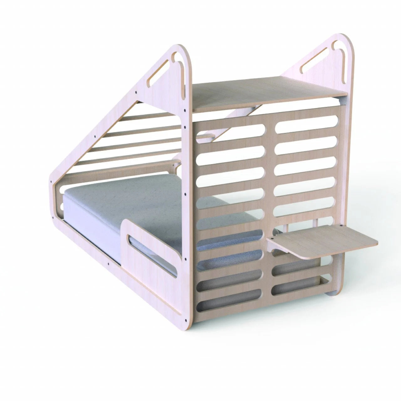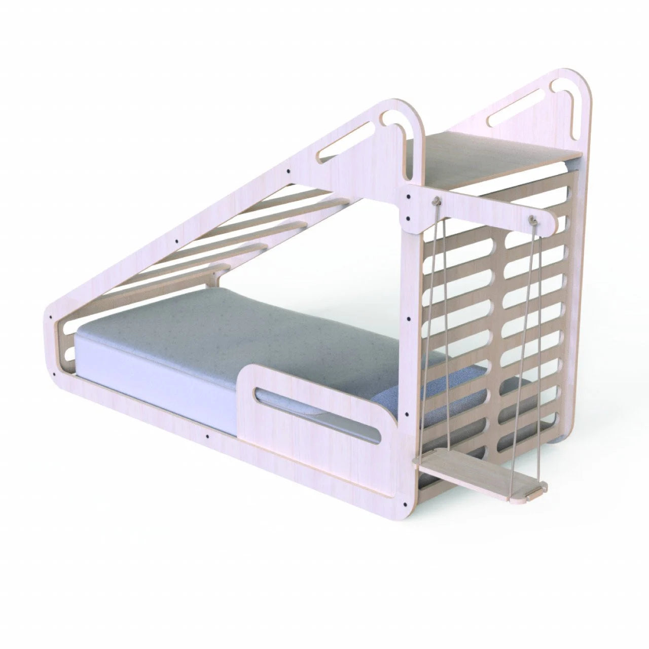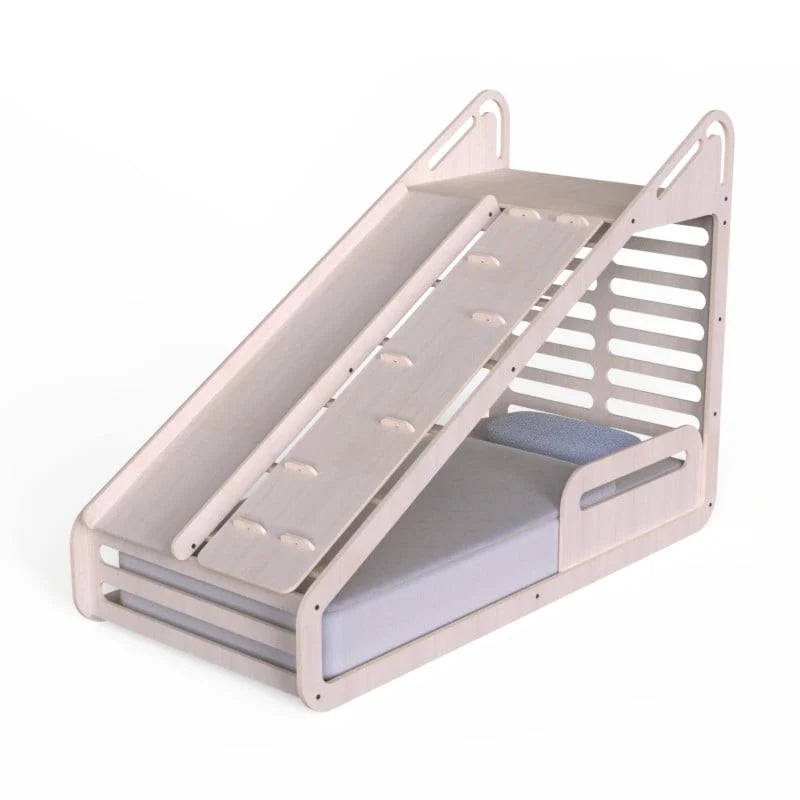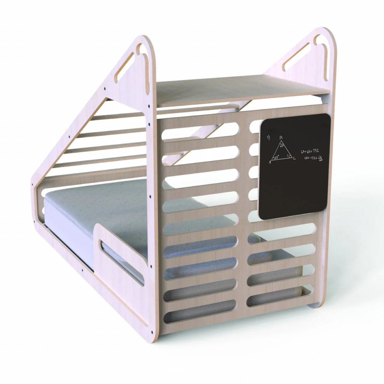 Pat Montessori de la MamaToyz, din lemn, cu tobogan, tabla de scris, masuta si leagan este in acelasi timp locul de somn al celui mic dar si cel mai tare loc de joaca.